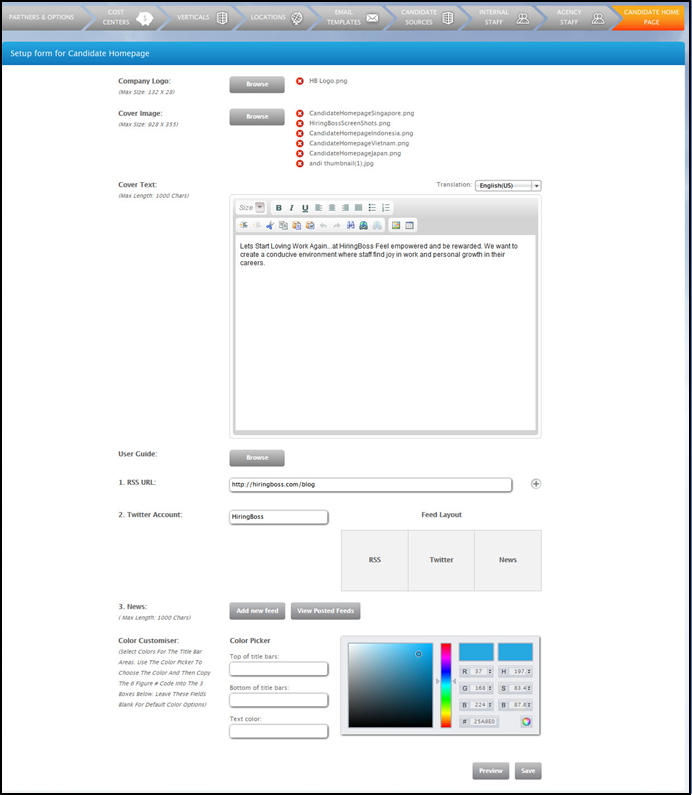 · The information to be displayed on the candidate homepage can be configured here: company logo, cover image, cover text, etc.