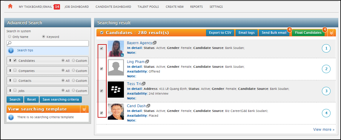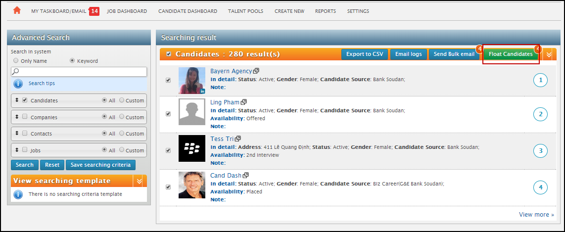 Candidates can be floated from the Advanced Search Tool, the Talent Pool page and/or the Candidate Profile page.