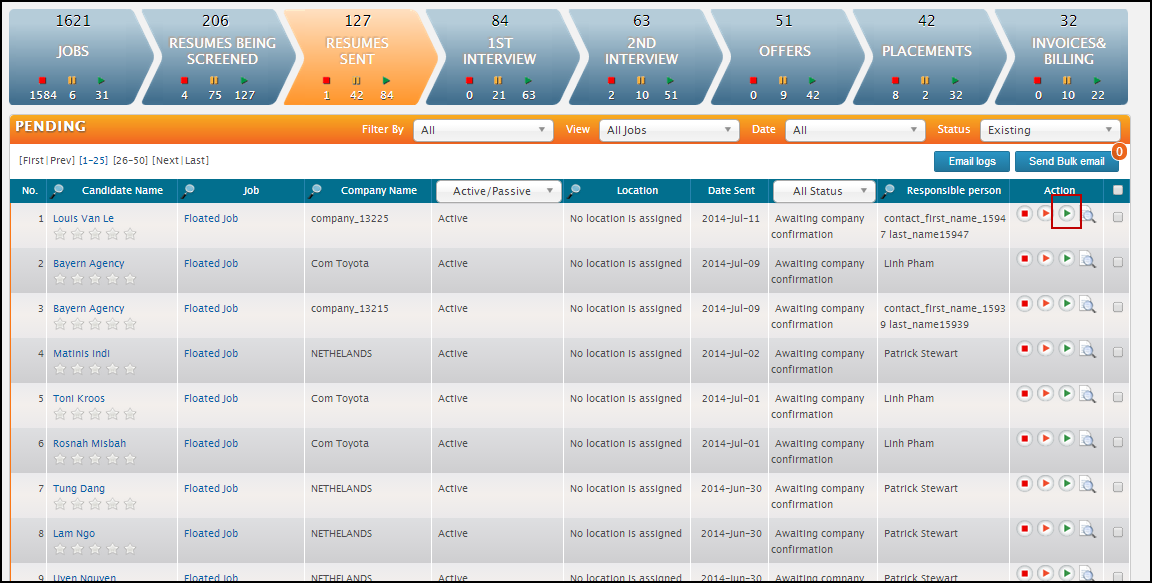 Once the email has been sent, the floated candidates will be placed in the “Resume Sent” chevron. The candidate can then be taken through the same process (and functionality) as if the candidate was attached to a real job, up until the offer stage. At this point, the floated candidate needs to be attached to a real job.