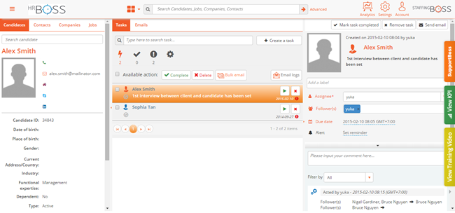 The Taskboard is separated in 3 parts as the frame for reference, the frame contains the tasks tab/emails tab and the frame to view the detail of the task/email. The left frame is a place to view the information of the candidate/contact/company/job. We call this the address book of the Taskboard where users are able to search for contact info. First, select a category from the candidates/contacts/companies/jobs tabs. Enter the keyword and a list of search results will appear. Select one of the results and details will be shown in the frame.