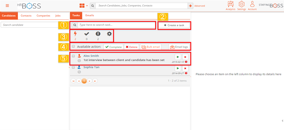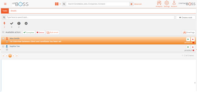 StaffingBoss allows user to take bulk action to the tasks. Check on the relevant emails you want to delete and click on the button.