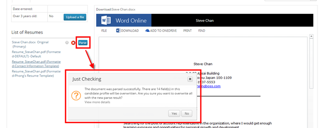 “Overwrite” button, the parsed data will be overwritten to the candidate profile.
