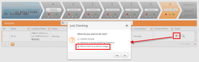 Undo action to the candidate processed to Offer, Placement and Invoice stage is now available.