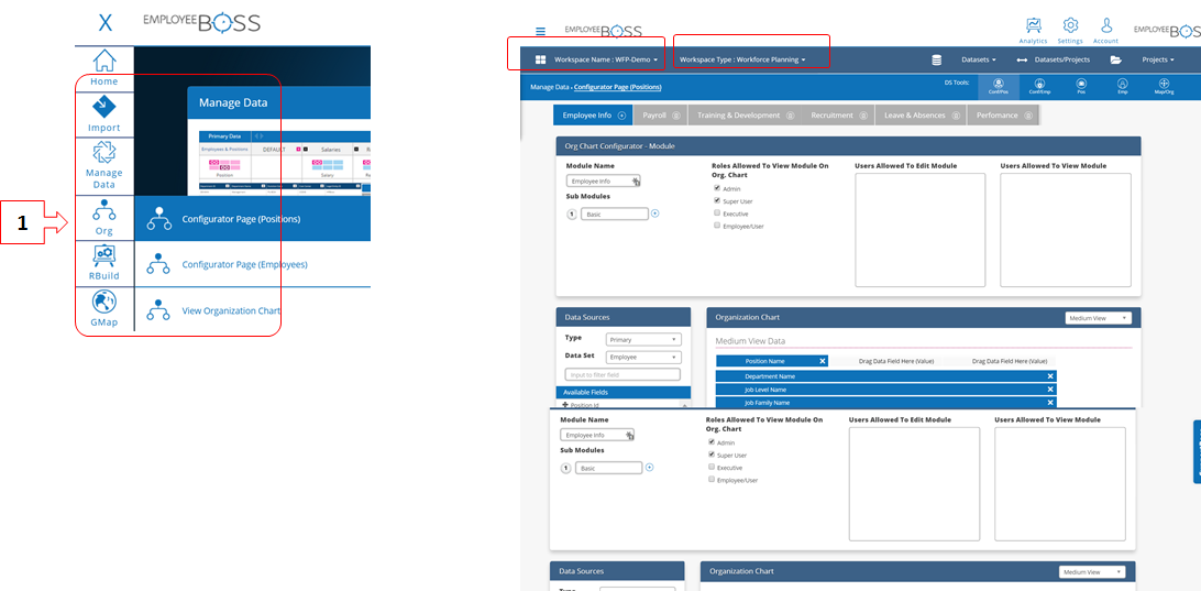 1. View and manage all modules of your organization chart 2. Choose the relevant Workspace Type 3. Choose the relevant Workspace Name